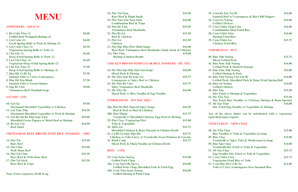 Vegetarian diners are also in for a treat with options like Rice Noodles w/ Tofu & Vegetables in Soup (Hủ Tiếu Chay) and Vermicelli w/ Spicy Tofu & Mushrooms in Soup (Bún Chay). These dishes maintain the same standard of flavor and heartiness, perfect for those looking for meat-free options without sacrificing taste.